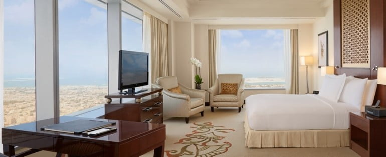 The hotel has an imposing and attractive Mediterranean-style exterior while inside you’ll find marbled corridors with high arches and Arabian design touches. I stayed in a deluxe skyline room with a dreamily comfortable bed, a sofa for lounging on and a well designed desk area. The room also featured an ipad for access to hotel information and services, a flat screen TV with Bluetooth speakers, reliable free wifi, and a large walk-in closet.
